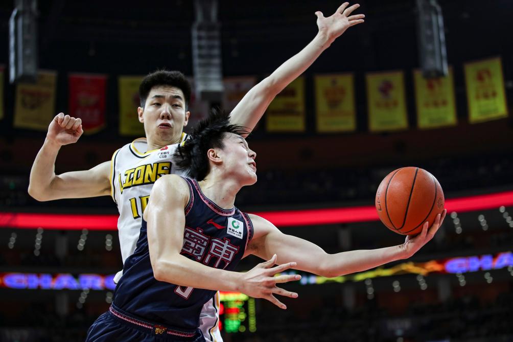 4月20日,广东队球员胡明轩(右)在比赛中上篮。新华社发(郑家雄摄)