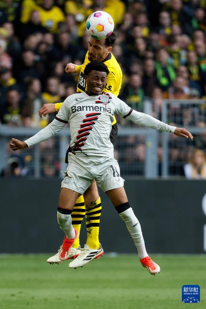 4月21日,多特蒙德队球员胡梅尔斯(后)与勒沃库森队球员泰拉在比赛中争顶。新华社发(约阿希姆·毕瓦勒兹摄)