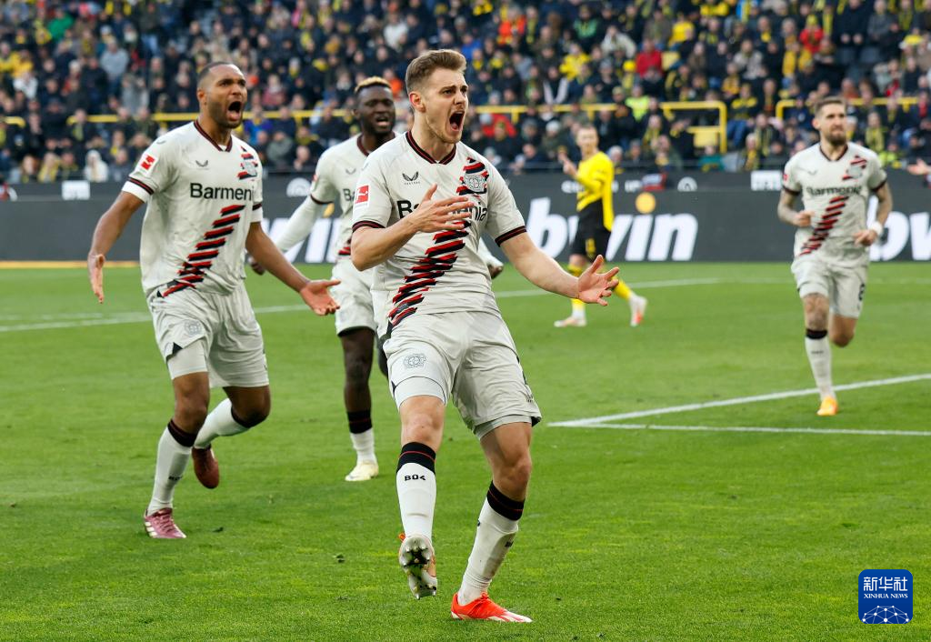 4月21日,勒沃库森队球员斯塔尼希奇(前)进球后庆祝。新华社发(约阿希姆·毕瓦勒兹摄)