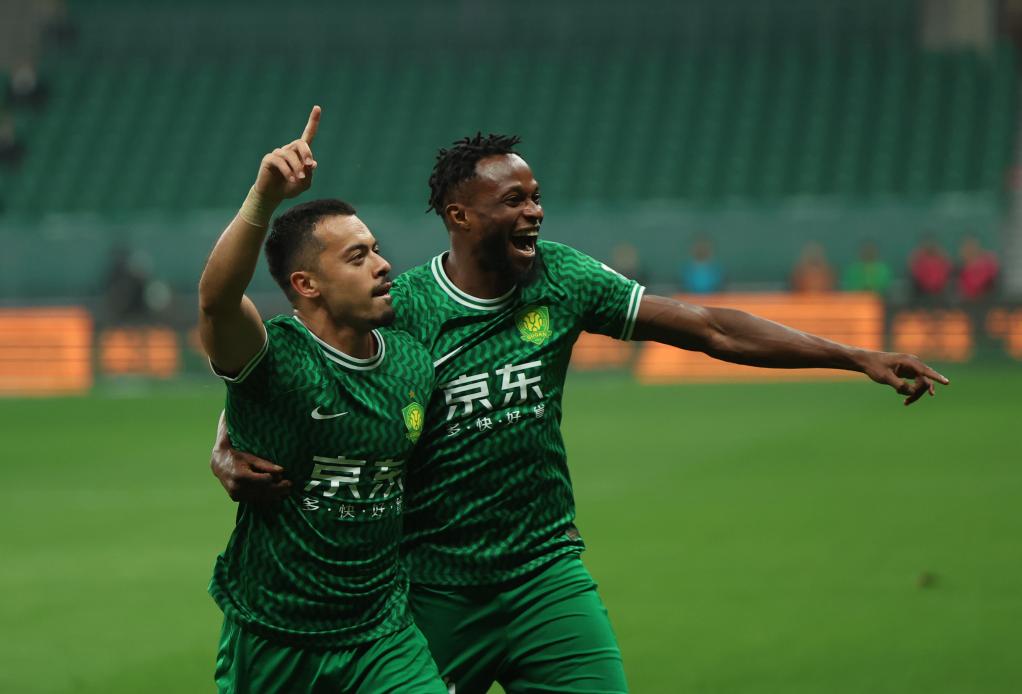 4月21日,北京国安队球员李可(左)打进球队本场第二粒进球后与队友阿德本罗庆祝。新华社记者 王楷焱 摄