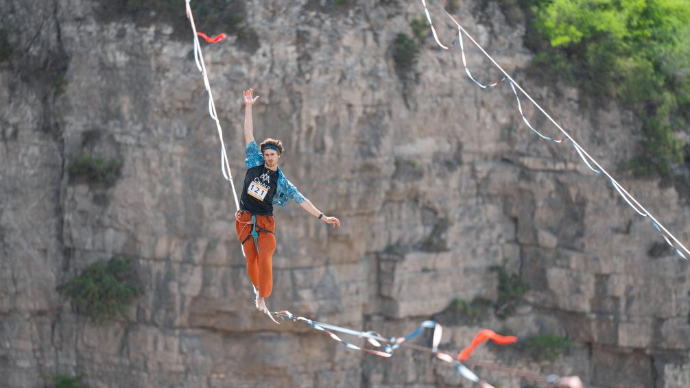 高空扁带是结合了攀岩、跑酷、体操等多种运动的新兴极限运动。在宽度仅有2.5厘米的扁带上,选手需要依靠自身维持平衡,比拼行走速度或技巧动作。
