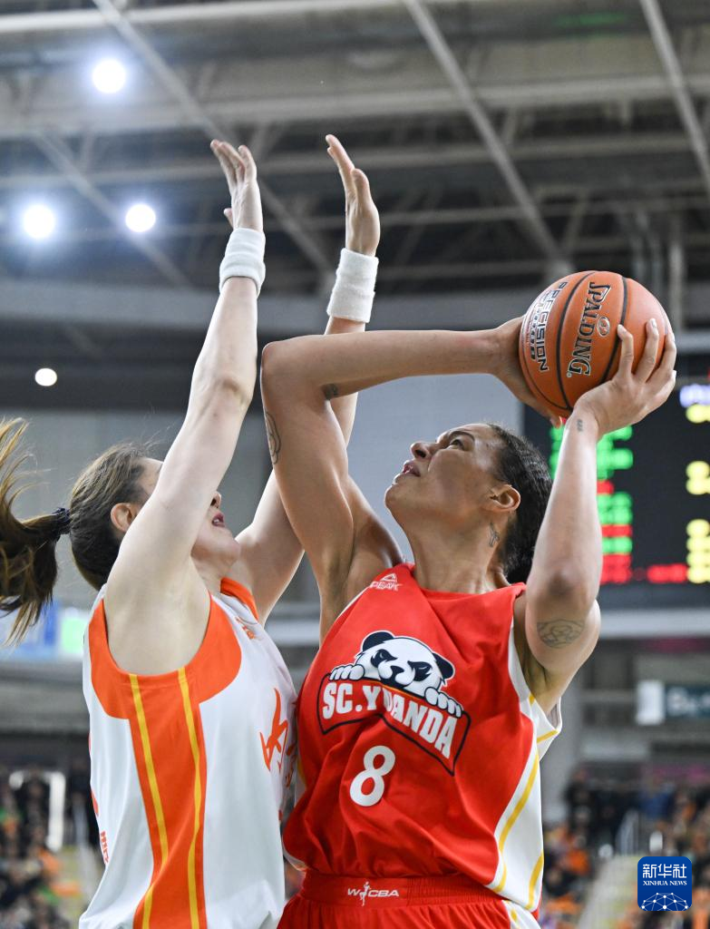 4月22日,四川远达美乐队球员李梦(左)在比赛中。新华社记者 连振 摄