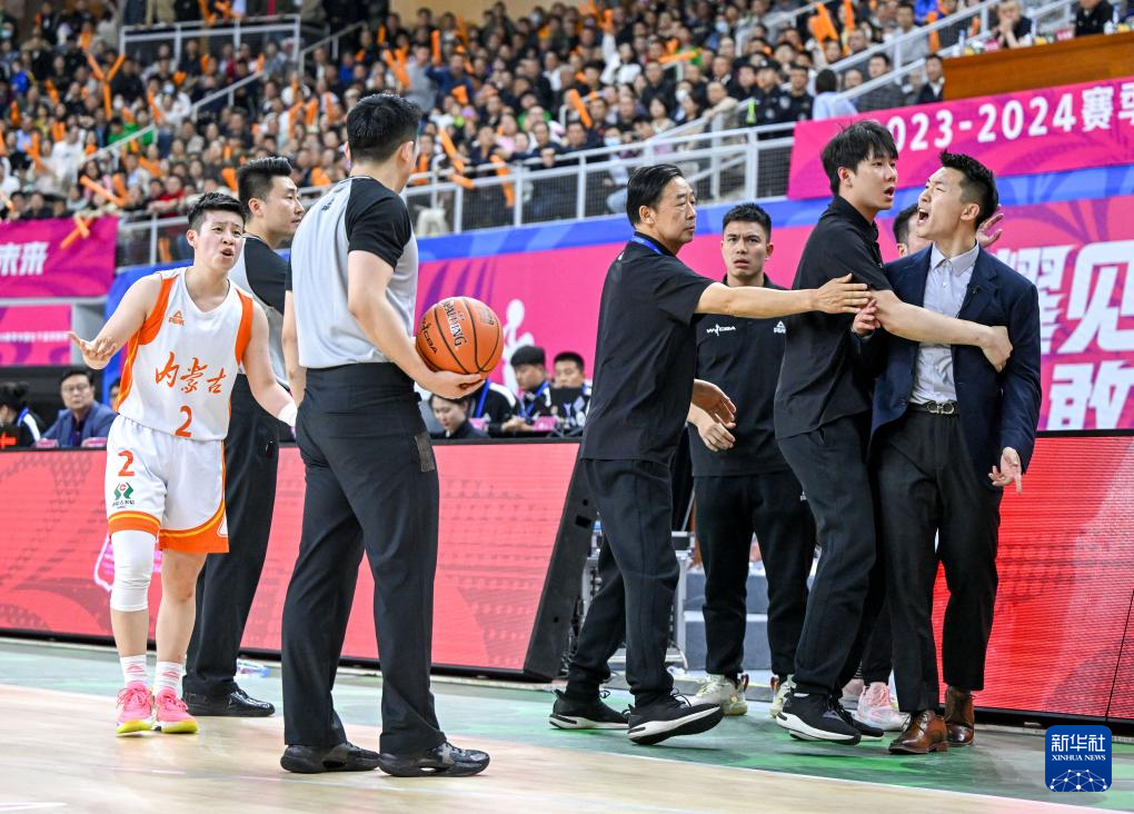 4月22日,内蒙古农信队教练杨赞(右一)在球员被判罚后。新华社记者 连振 摄