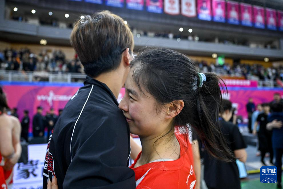 4月22日,四川远达美乐队球员王思雨(右)在赛后庆祝。新华社记者 连振 摄
