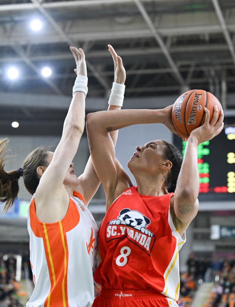 4月22日,四川远达美乐队球员李梦(左)在比赛中。新华社记者 连振 摄