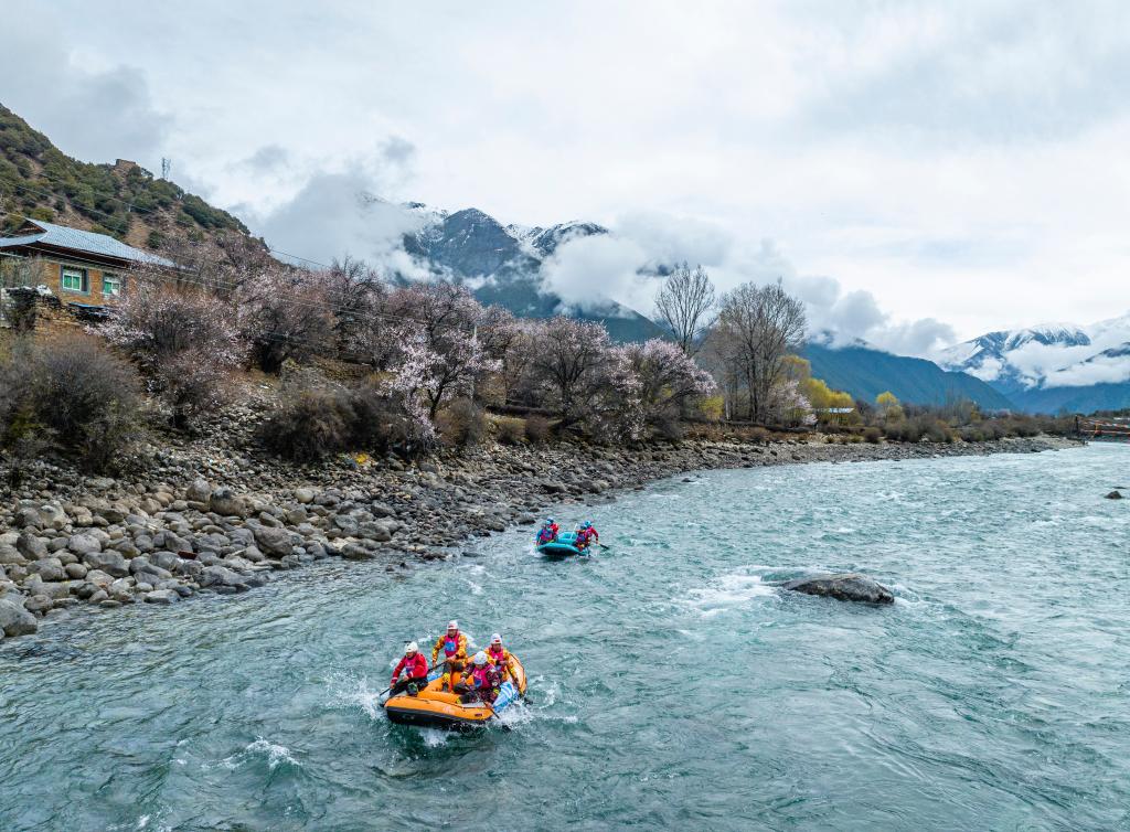 选手们在四人漂流艇拉力赛中(4月21日摄,无人机照片)。