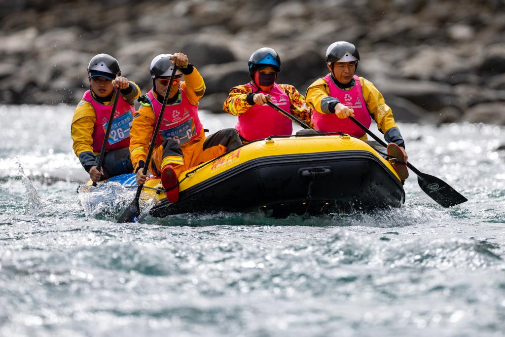 岑南琴(右二)在四人漂流艇拉力赛中。(4月21日摄)。新华社记者 姜帆 摄