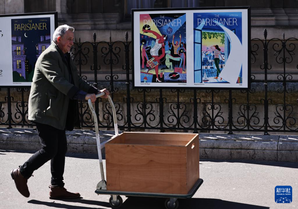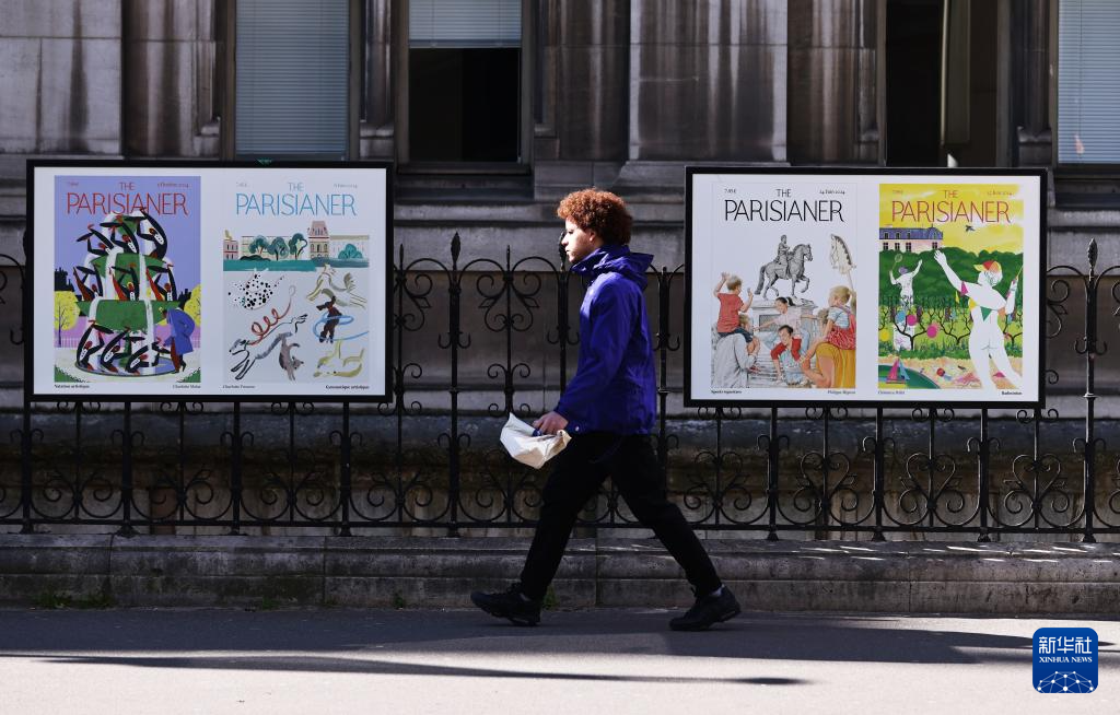 4月23日,在法国巴黎市政厅附近,一名男子经过“巴黎城里的体育运动”主题海报。新华社记者 高静 摄