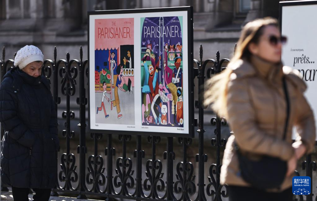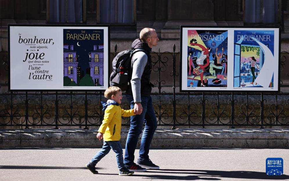 4月23日,在法国巴黎市政厅附近,人们经过“巴黎城里的体育运动”主题海报。新华社记者 高静 摄