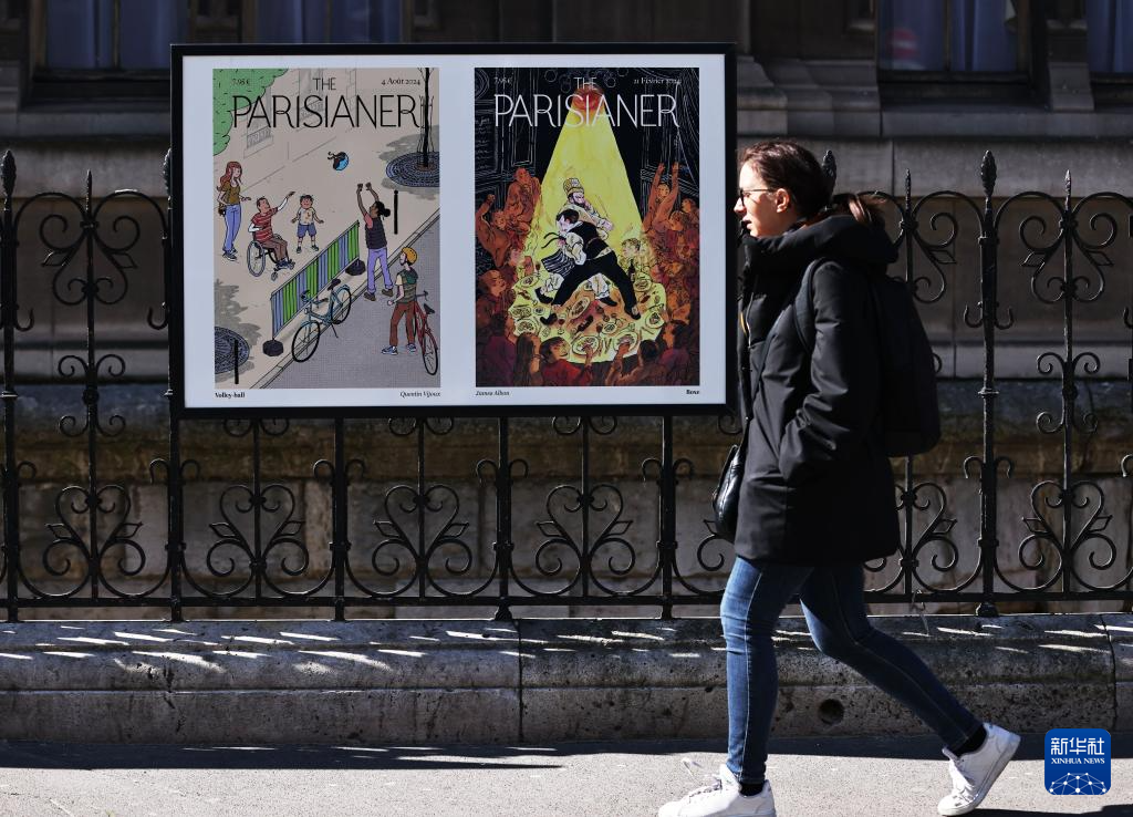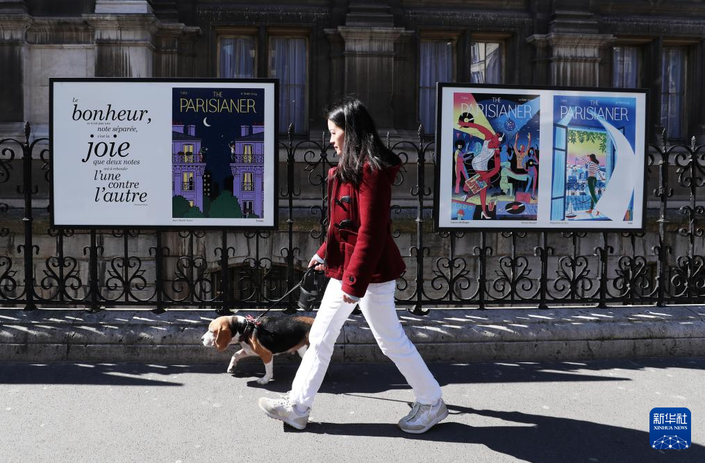 4月23日,在法国巴黎市政厅附近,一名女士经过“巴黎城里的体育运动”主题海报。新华社记者 高静 摄