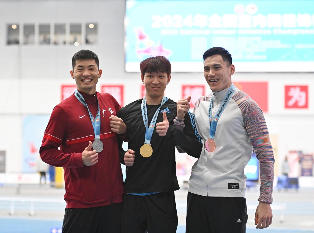 2024年3月29日,2024年全国室内田径锦标赛男子撑杆跳高冠军安徽队选手钟涛(中)、亚军广东队选手黄博凯(左)、季军山西队选手姚捷在颁奖仪式上。新华社记者 宋彦桦 摄
