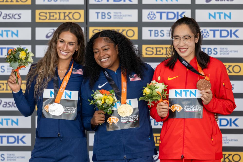 2023年8月23日,2023世界田径锦标赛女子铁饼冠军美国选手陶萨加(中)、亚军美国选手奥尔曼(左)与季军中国选手冯彬在颁奖仪式上合影。新华社记者 孟鼎博 摄