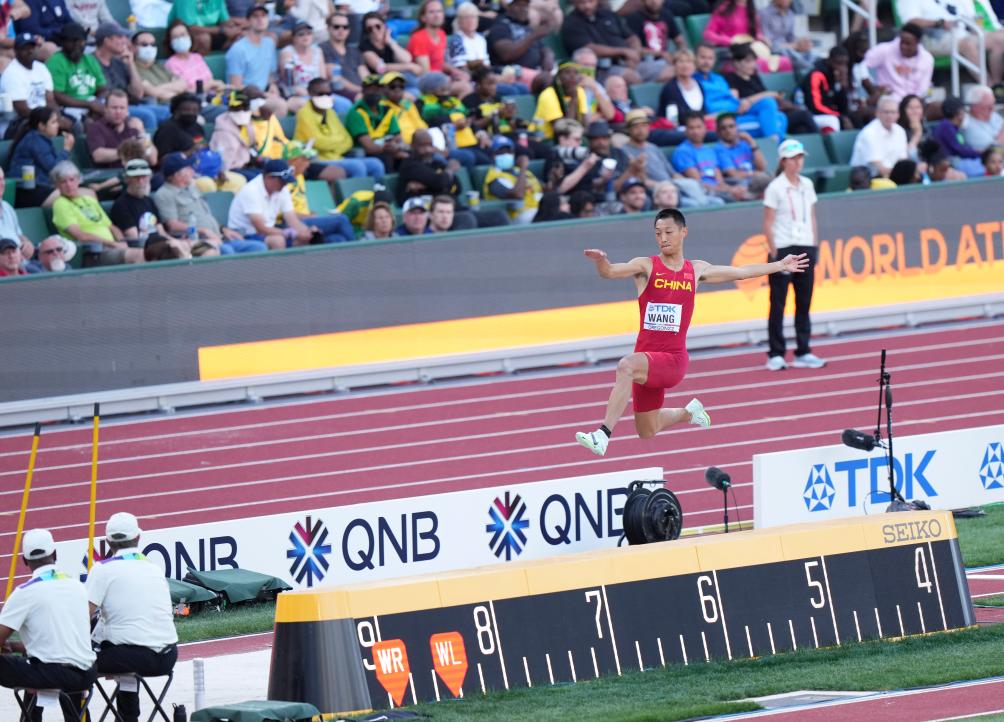 2022年7月16日,在美国俄勒冈州尤金市举行的2022世界田径锦标赛男子跳远决赛中,中国选手王嘉男以8米36的成绩夺得冠军。新华社记者 王迎 摄