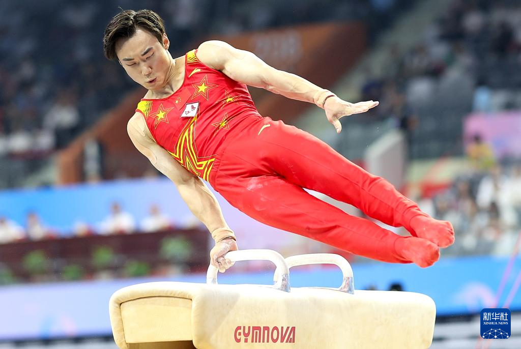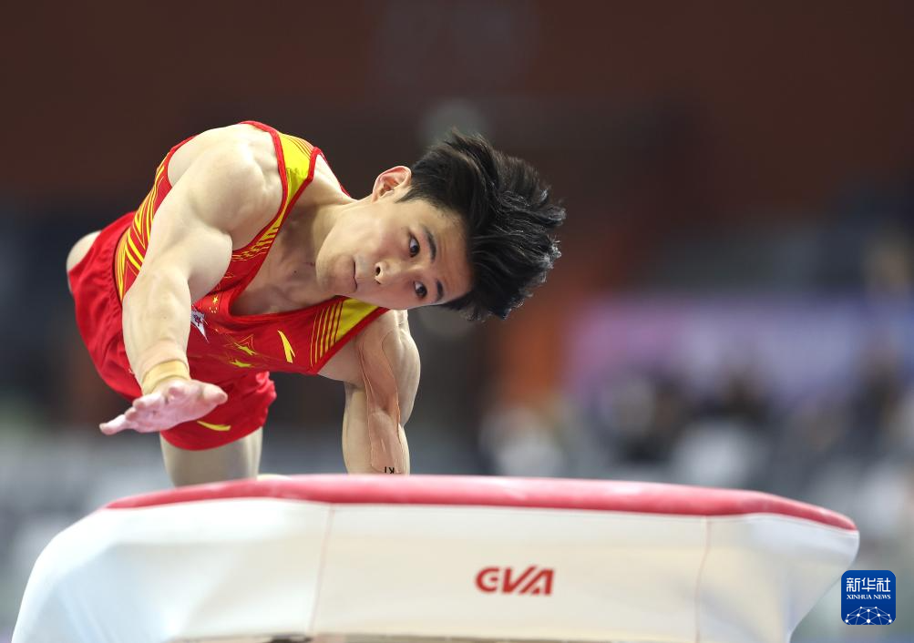 4月26日,湖南队选手张博恒在鞍马项目比赛中。最终,他因伤退赛。新华社记者 曹灿 摄