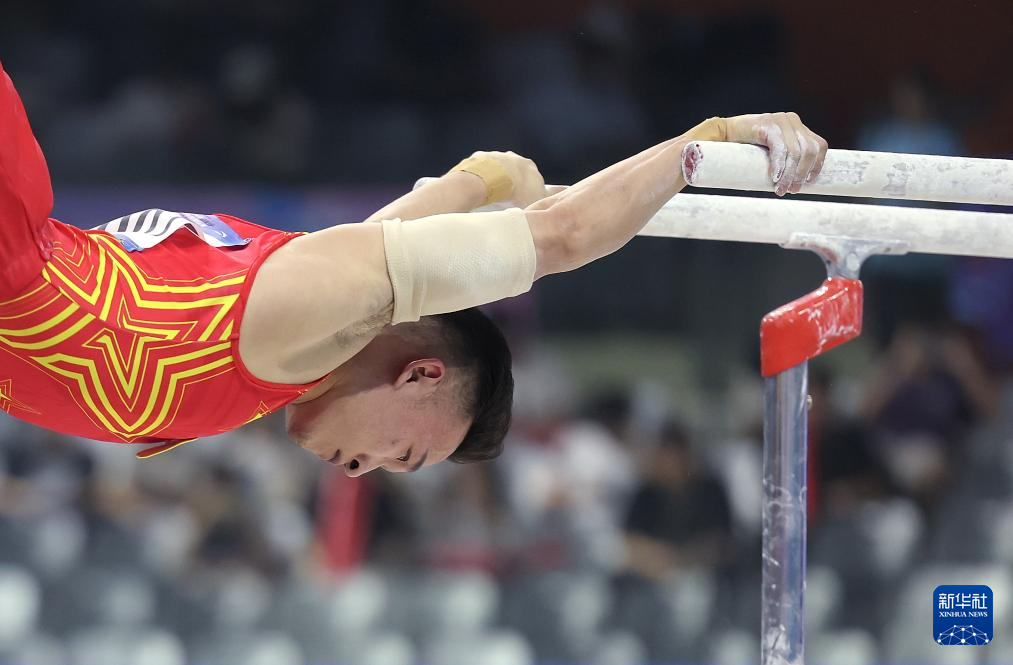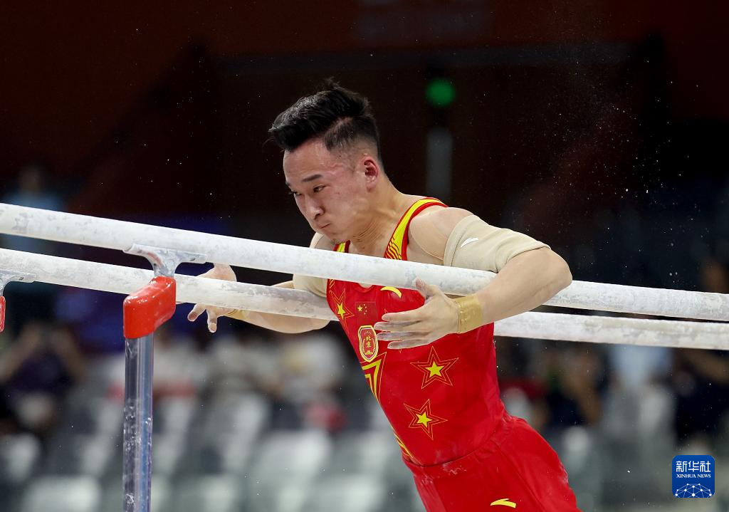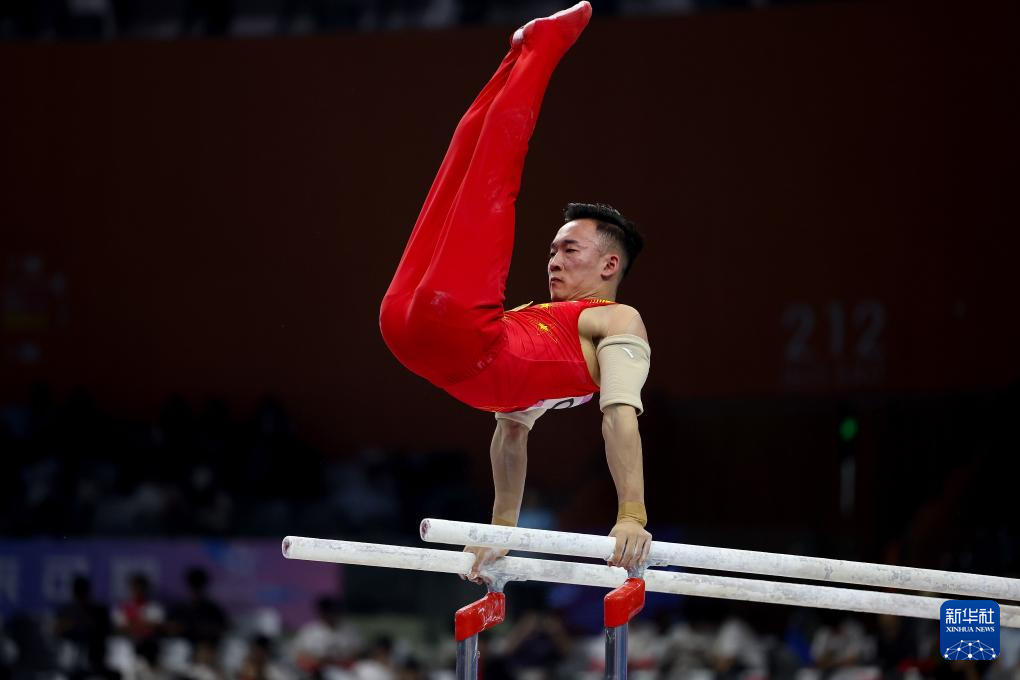4月26日,北京队选手肖若腾在双杠项目比赛中。新华社记者 曹灿 摄