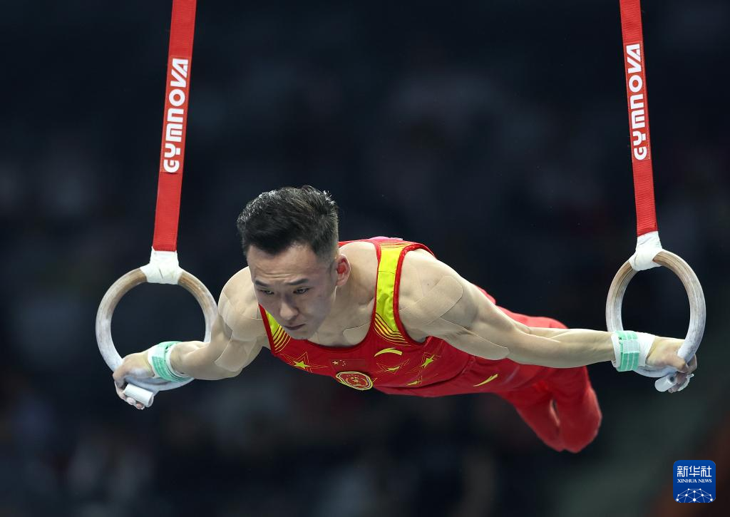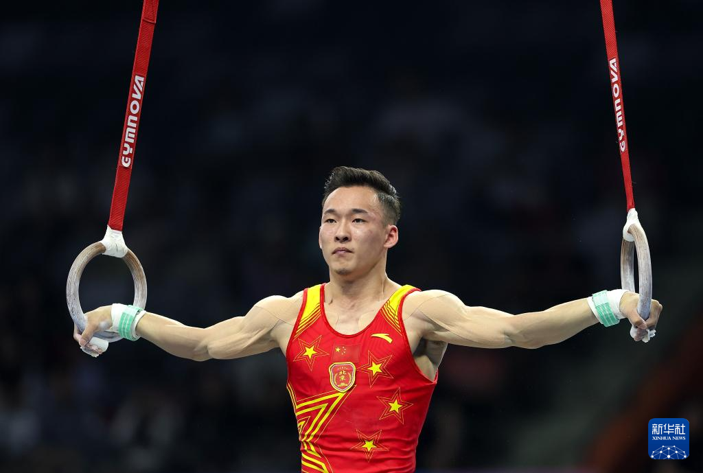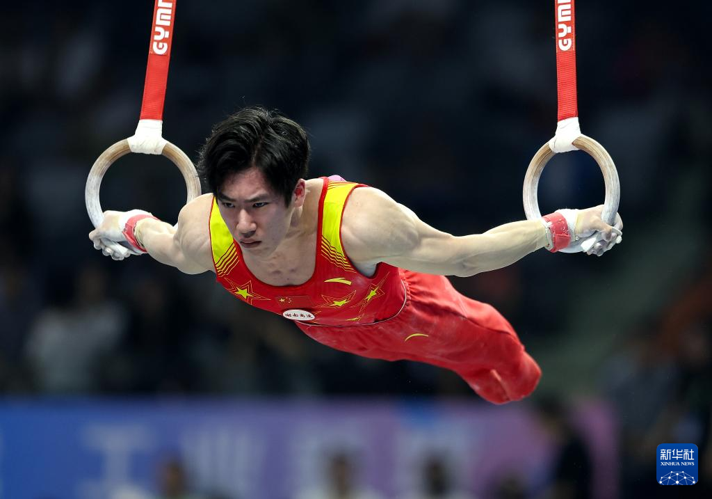 4月26日,北京队选手肖若腾在吊环项目比赛中。新华社记者 曹灿 摄