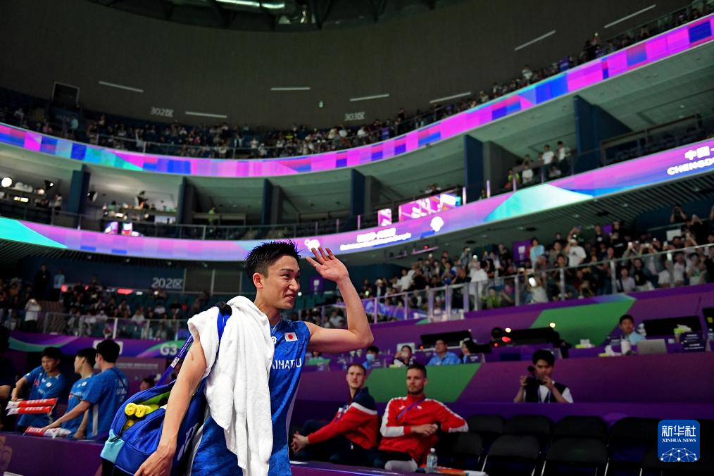 4月28日,日本队选手桃田贤斗在男单比赛后向球迷致谢。他2比0战胜捷克队选手科普日瓦。新华社记者 侯昭康 摄