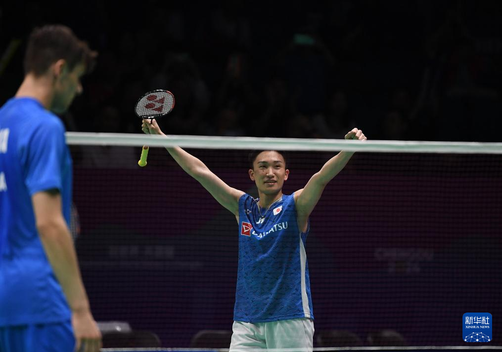 4月28日,日本队选手桃田贤斗(右)在男单比赛后庆祝胜利。他2比0战胜捷克队选手科普日瓦。新华社记者 侯昭康 摄