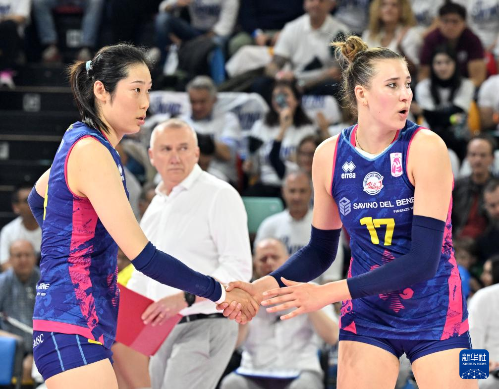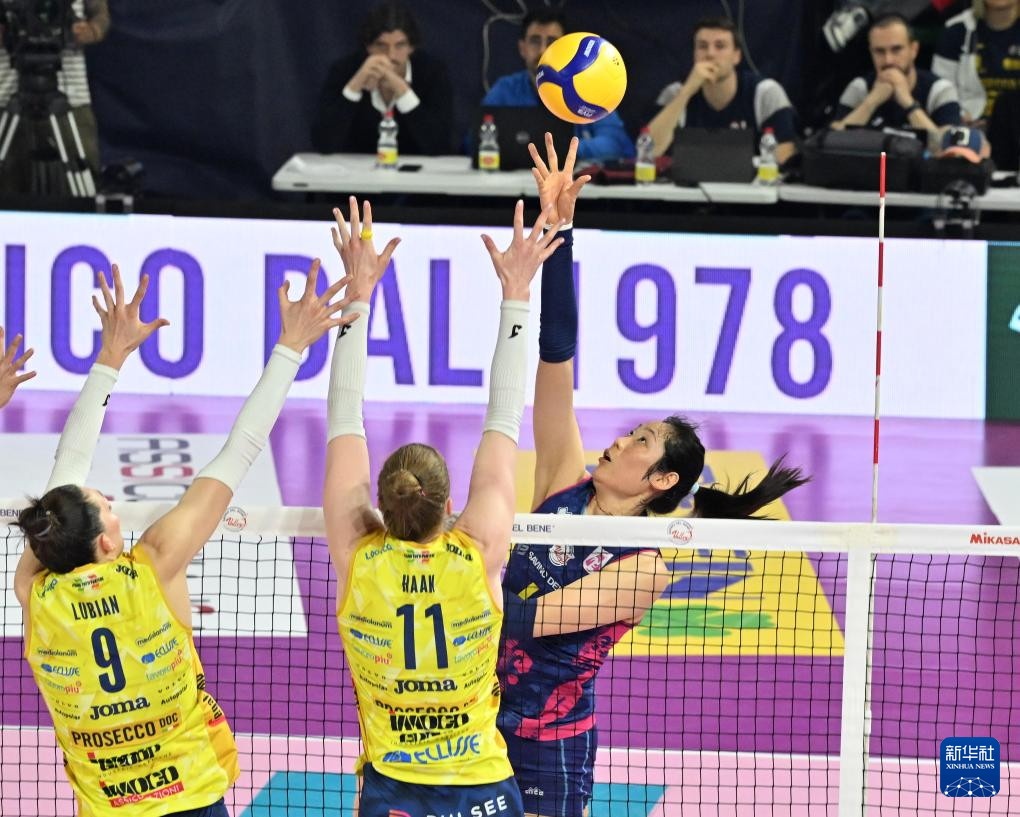 4月27日,斯坎迪奇队球员朱婷(右)在比赛中。新华社发