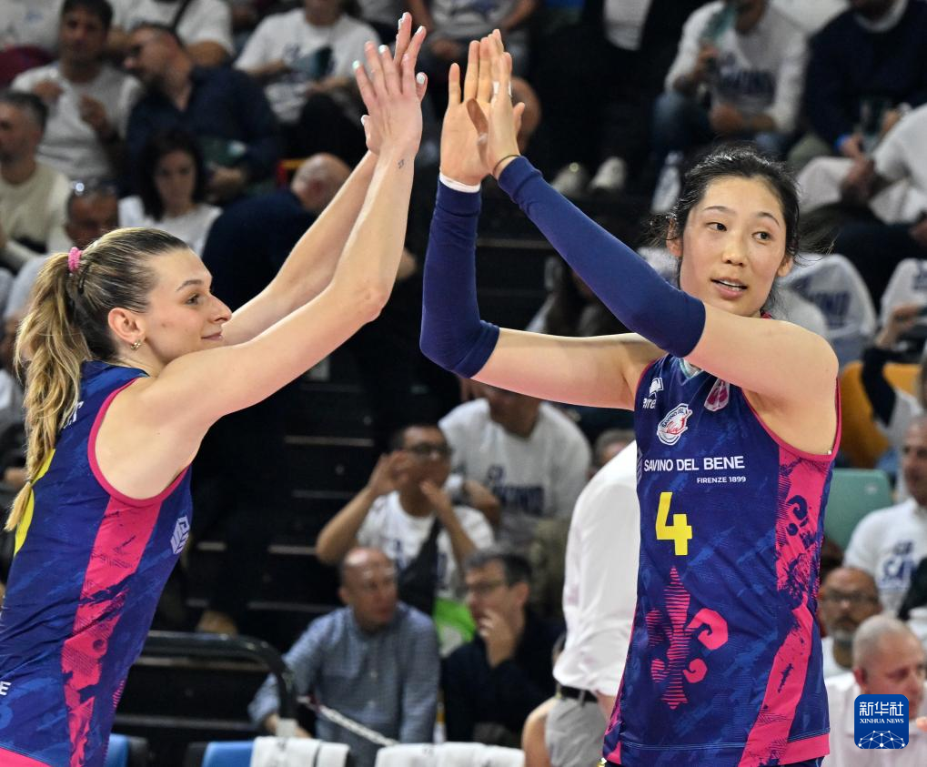4月27日,斯坎迪奇队球员朱婷(左)与队友安特罗波娃击掌。新华社发