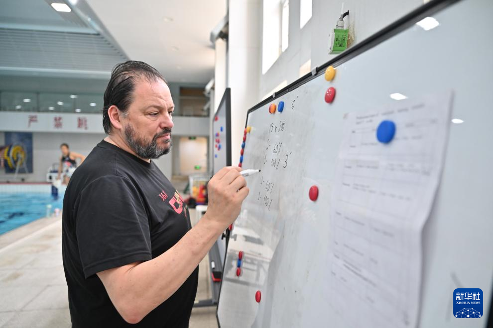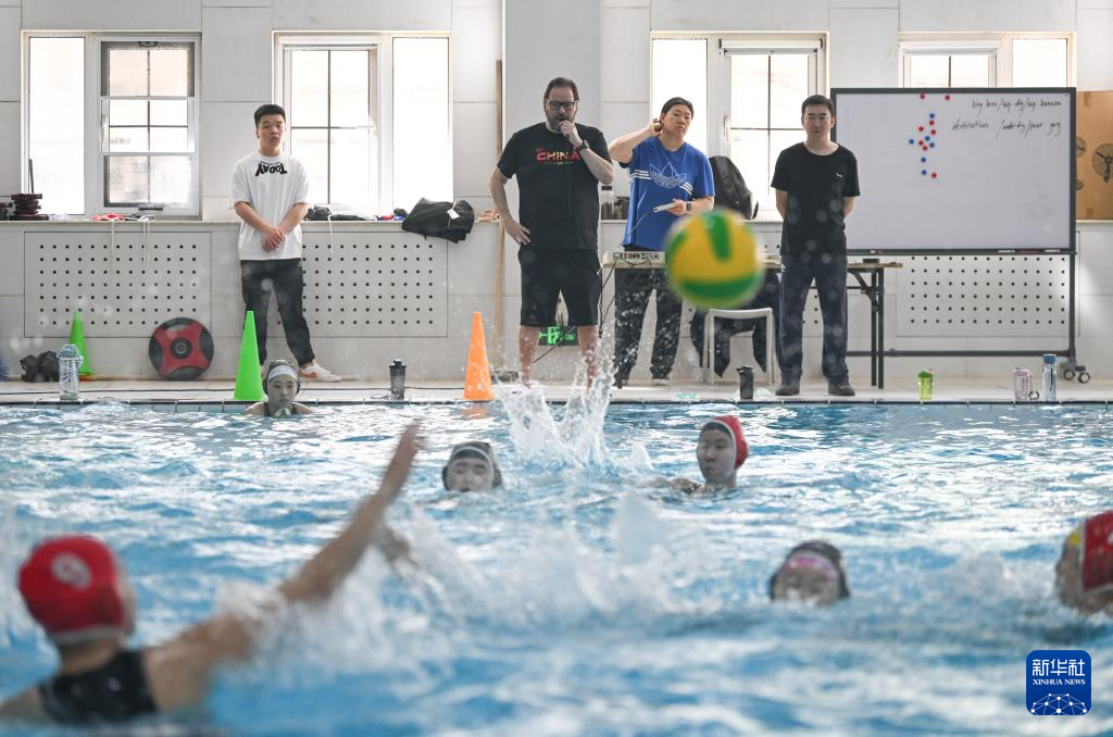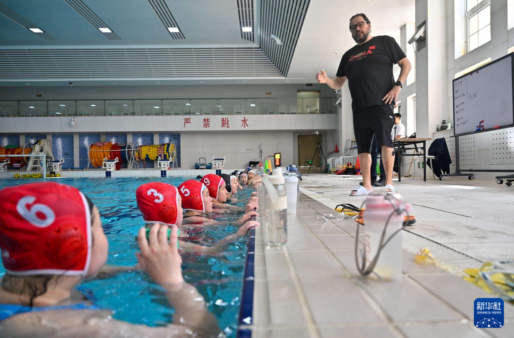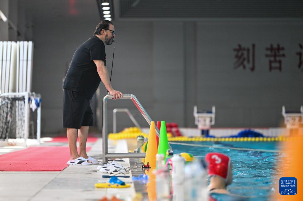 塞奥哈里斯(中)在泳池边指导球队进行训练(4月24日摄)。新华社记者 孙凡越 摄