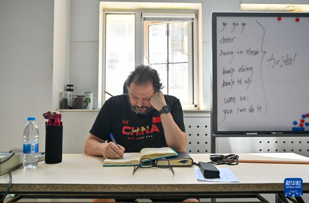 塞奥哈里斯将训练计划和要求写在白板上(4月23日摄)。新华社记者 孙凡越 摄