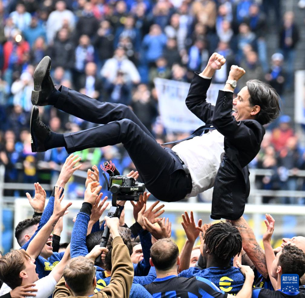 4月28日,国际米兰队球员抛起主教练因扎吉。新华社发(奥古斯托·卡萨索利摄)