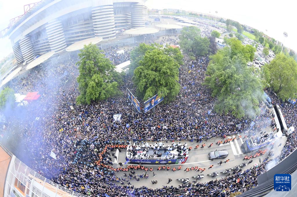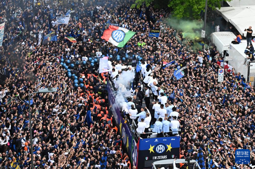 4月28日,在意大利米兰,国际米兰队乘坐大巴车与球迷庆祝,此前国际米兰队已提前五轮夺得联赛冠军。新华社发(奥古斯托·卡萨索利摄)