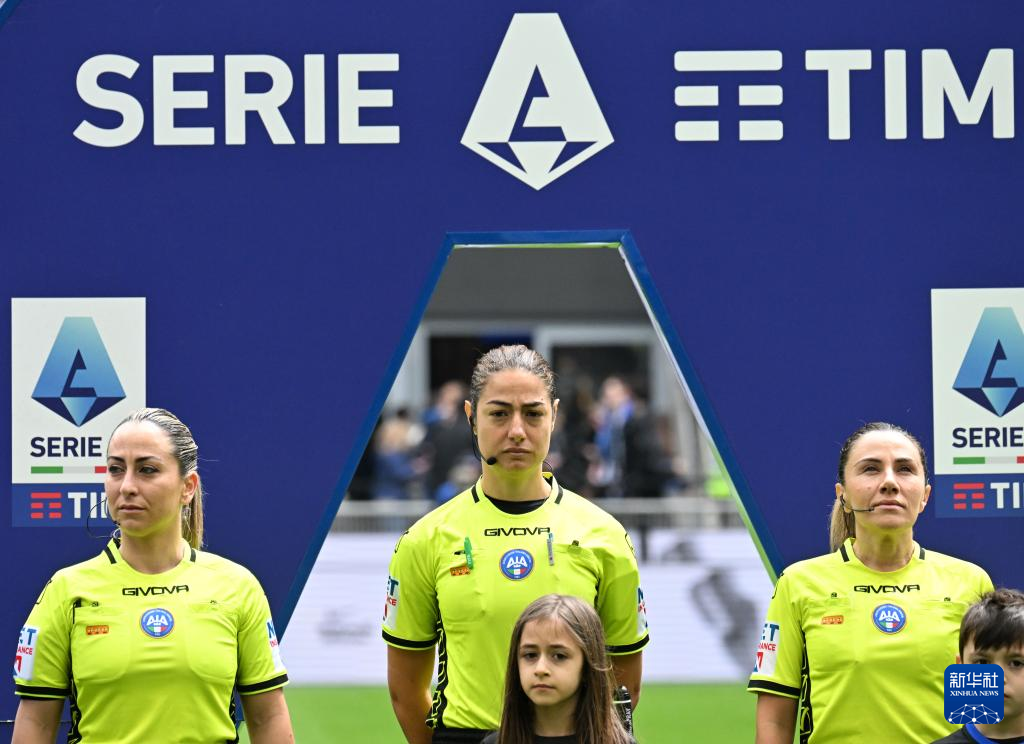 4月28日,主裁判卡普蒂(中)、助理裁判迪蒙特(右)和特拉夏蒂在赛前。这是意甲比赛第一次采用全女性裁判组。新华社发(奥古斯托·卡萨索利摄)