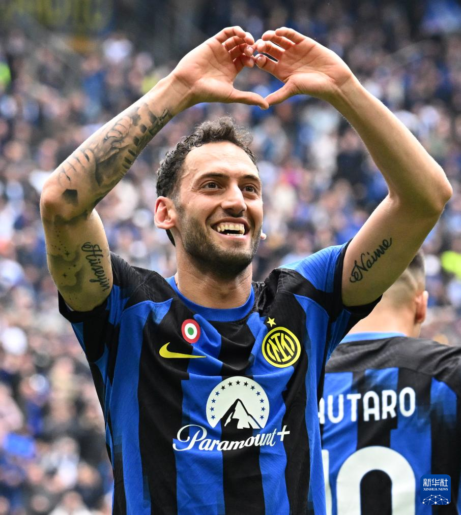 4月28日,国际米兰队球员恰尔汗奥卢庆祝进球。新华社发(奥古斯托·卡萨索利摄)