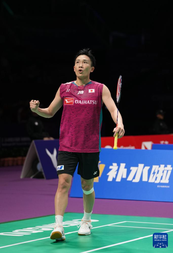 4月29日,日本队选手桃田贤斗在男单比赛中庆祝得分。他2比0战胜德国队选手马蒂亚斯·基克利茨。新华社记者 江宏景 摄