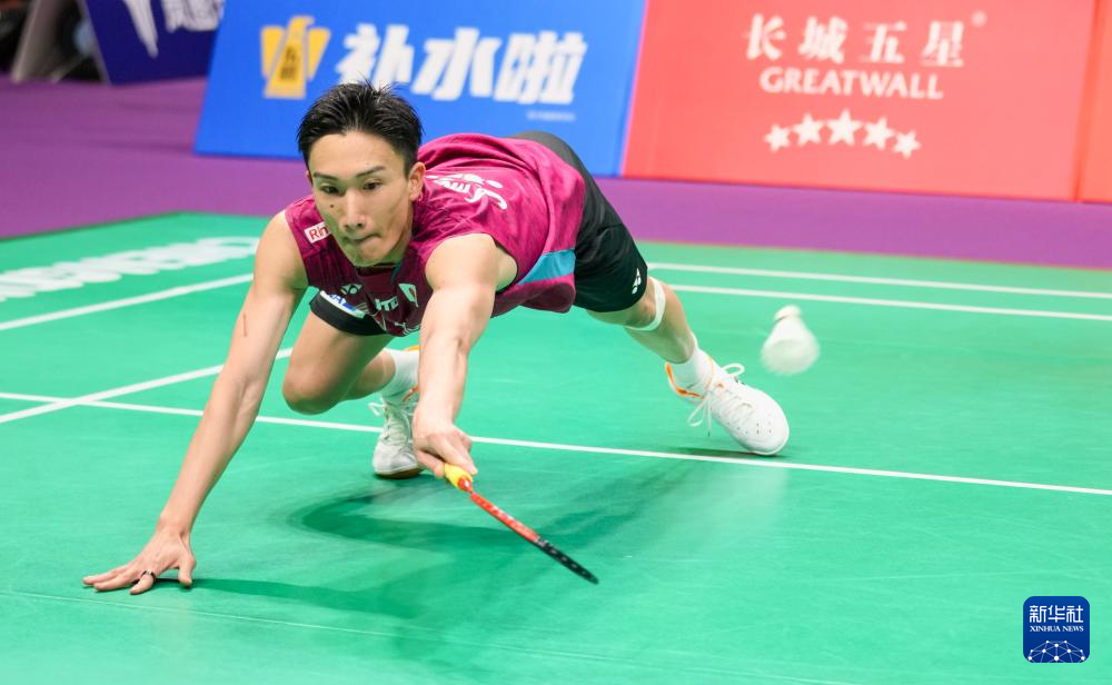 4月29日,日本队选手桃田贤斗在男单比赛中回球。他2比0战胜德国队选手马蒂亚斯·基克利茨。新华社记者 江宏景 摄