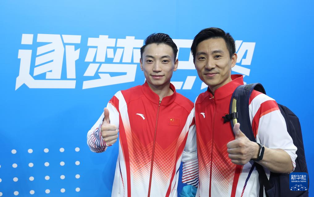 4月29日,四川队选手邹敬园(左)与教练腾海滨在比赛后合影。新华社记者 曹灿 摄