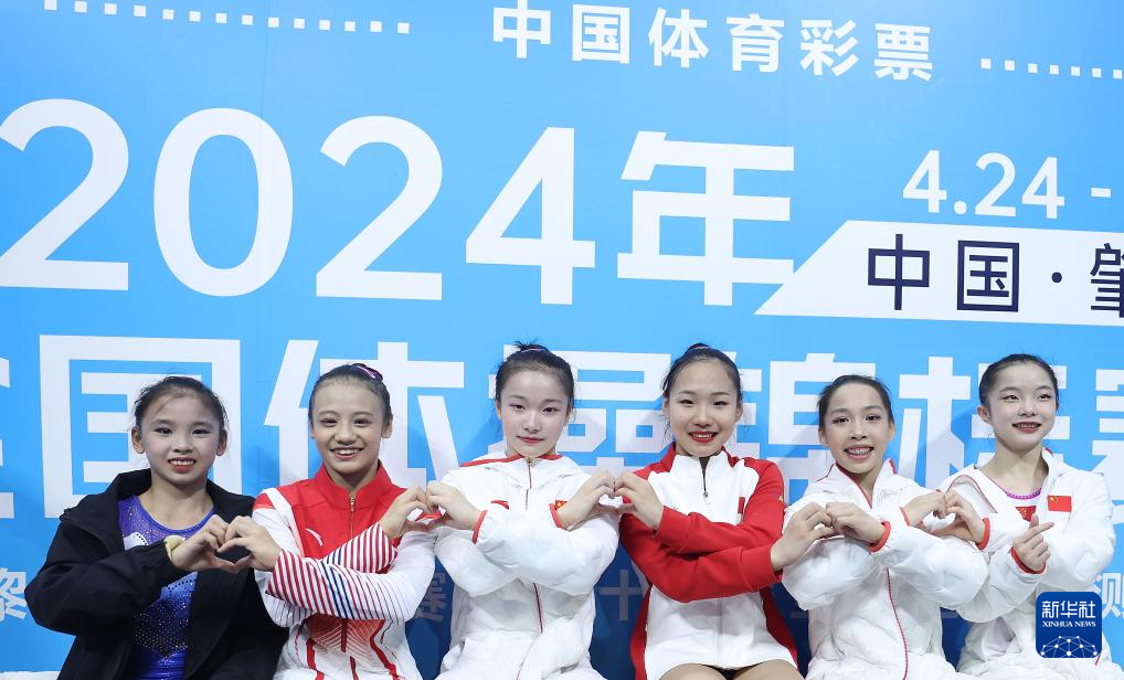 4月29日,湖南队选手李荣津伊、福建队选手邱祺缘、浙江队选手金孝轩、山东队选手杨静熙、湖北队选手陈欣怡、河南队选手张怡涵(从左至右)在比赛间隙合影。新华社记者 曹灿 摄