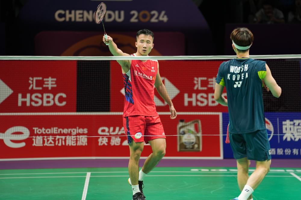李诗沣2:0战胜李伦圭再次为中国队取得领先后,第二双打刘雨辰/欧烜屹与奇东柱/金元浩陷入缠斗。前两局双方战平,决胜局经历9次平分后,韩国组合23:21赢下该场,两队战成2:2平。