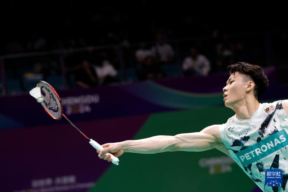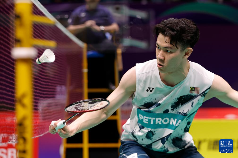 4月30日,马来西亚队选手李梓嘉在男子单打比赛中回球。最终,他0比2不敌丹麦队选手安赛龙。新华社记者 沈伯韩 摄