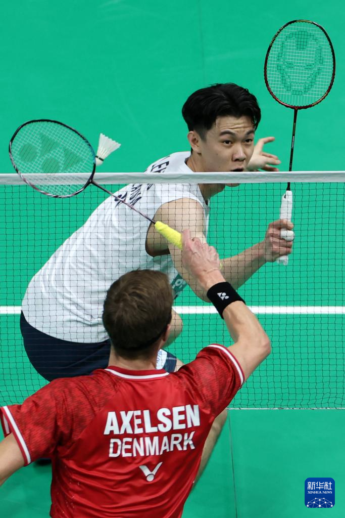4月30日,马来西亚队选手李梓嘉(上)在男子单打比赛中回球。最终,他0比2不敌丹麦队选手安赛龙。新华社记者 陈斌 摄