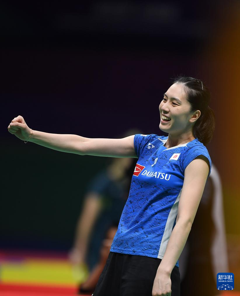 5月1日,日本队选手大堀彩在女单比赛后庆祝获胜。她2比1战胜印度尼西亚队选手瓦多约。新华社记者 侯昭康 摄