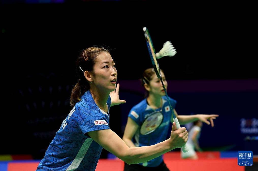 5月1日,日本队组合松山奈末(左)/志田干阳在女双比赛中。她们2比1战胜印度尼西亚队组合玛雅萨利/西蒂。新华社记者 侯昭康 摄