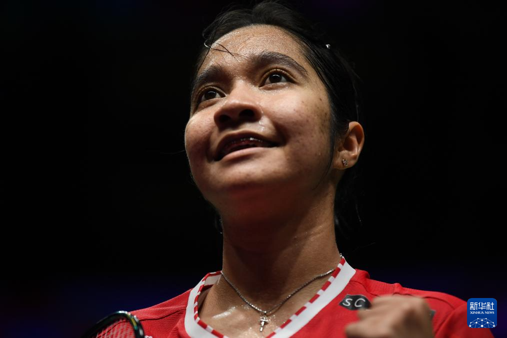 5月4日,印度尼西亚队选手玛丽斯卡在女单比赛中庆祝得分。她2比0战胜韩国队选手沈有振。新华社记者 江宏景 摄