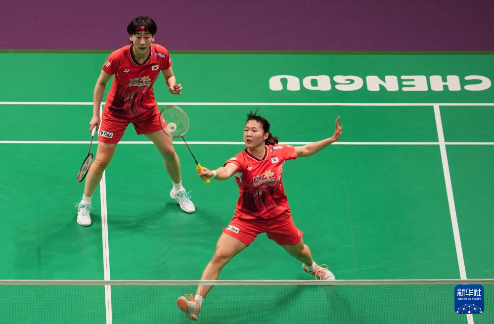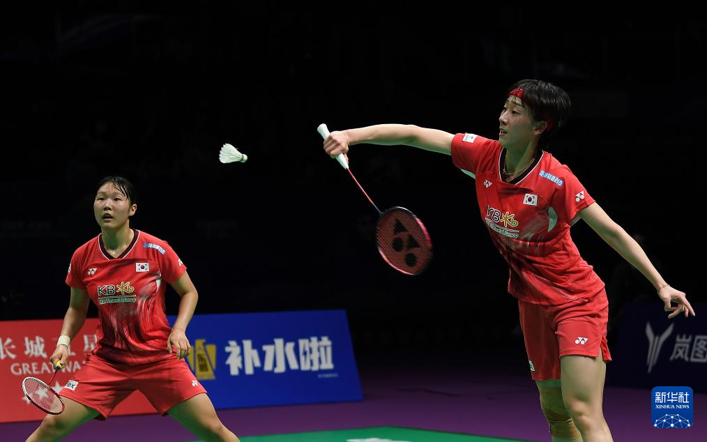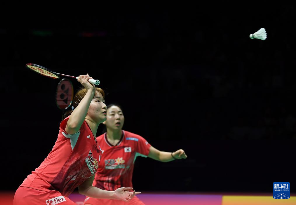 5月4日,韩国队组合白荷娜 (右)/李绍希在女双比赛中回球。她们2比0战胜印度尼西亚队组合拉哈尤/拉马丹蒂。新华社记者 江宏景 摄