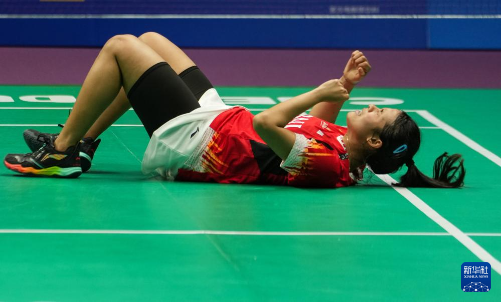 5月4日,印度尼西亚队选手德维在女单比赛中2比1战胜韩国队选手金敏善后倒地庆祝。新华社记者 江宏景 摄
