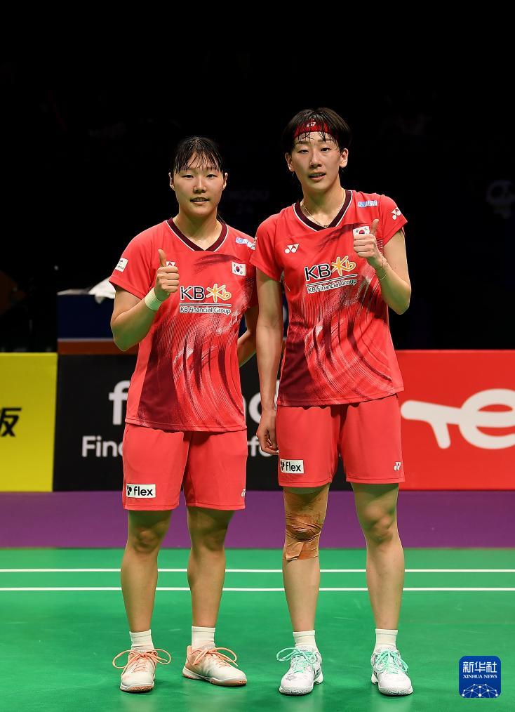 5月4日,韩国队组合白荷娜 (左)/李绍希在女双比赛后合影。她们2比0战胜印度尼西亚队组合拉哈尤/拉马丹蒂。新华社记者 侯昭康 摄