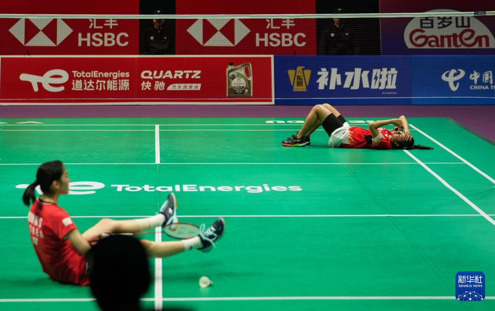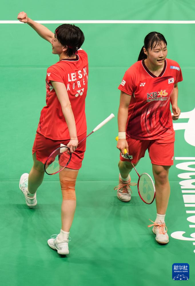 5月4日,韩国队组合白荷娜 (右)/李绍希在女双比赛后庆祝。她们2比0战胜印度尼西亚队组合拉哈尤/拉马丹蒂。新华社记者 江宏景 摄