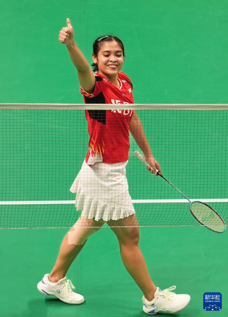 5月4日,印度尼西亚队选手瓦多约在女单比赛中庆祝得分。她2比1战胜韩国队选手金佳蓝。新华社记者 侯昭康 摄