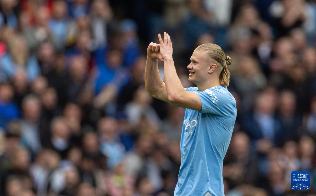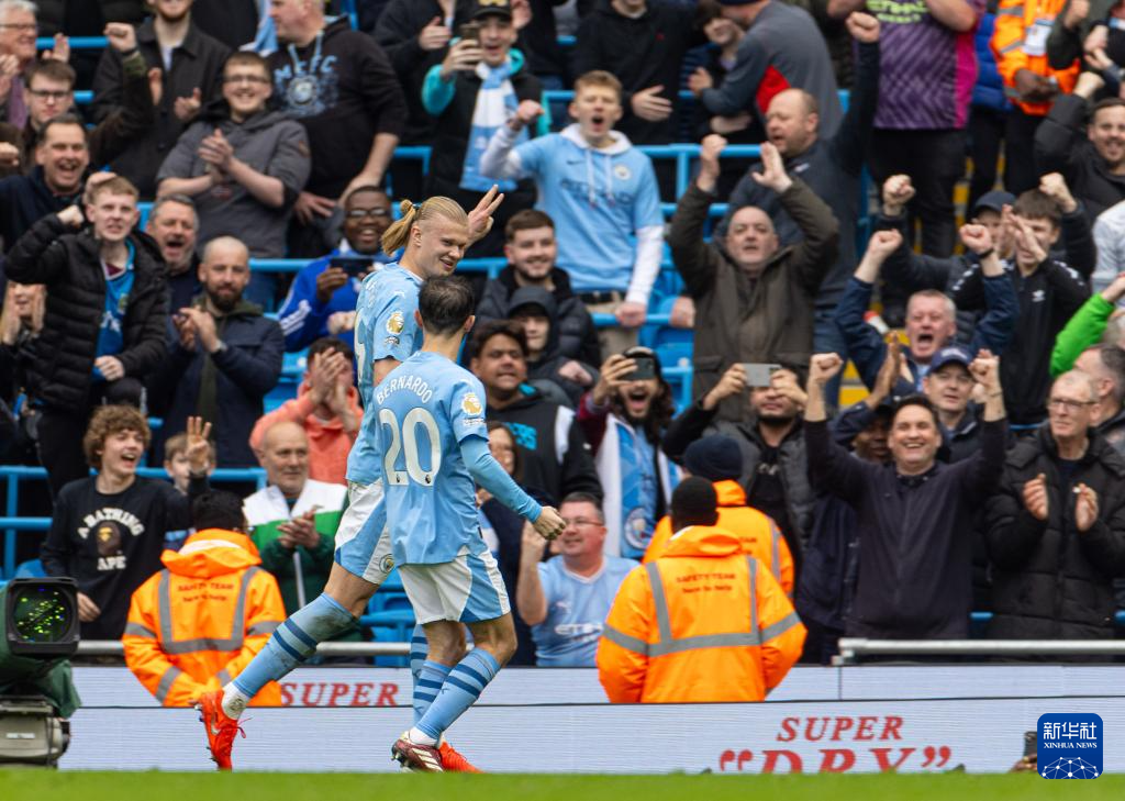 5月4日,曼彻斯特城队球员哈兰德(右)攻入自己在本场比赛的第四粒进球。新华社发
