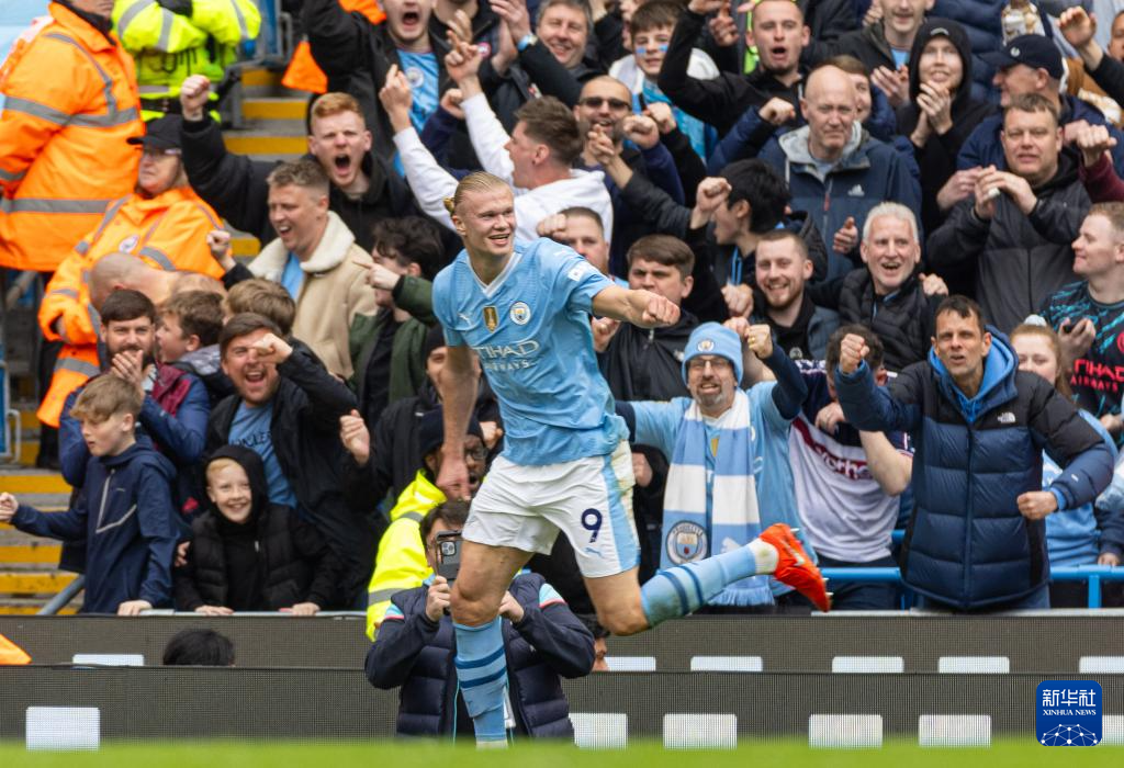 5月4日,曼彻斯特城队球员哈兰德庆祝自己在本场比赛的第二粒进球。新华社发