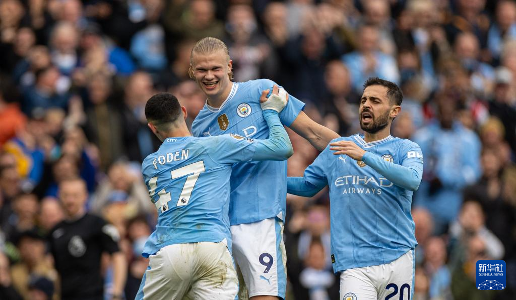 5月4日,曼彻斯特城队球员哈兰德(中)庆祝自己在本场比赛的第四粒进球。新华社发