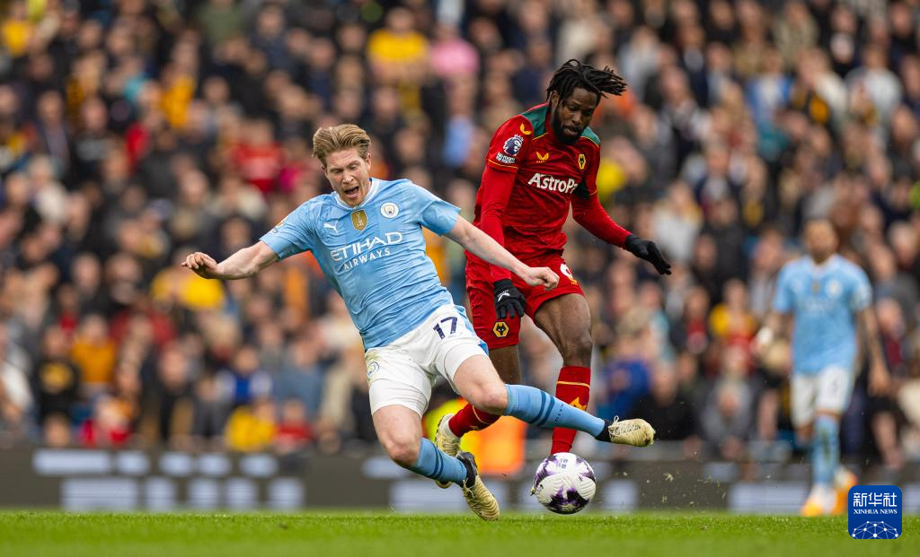 5月4日,曼彻斯特城队球员德布劳内(左)与狼队球员特拉奥雷拼抢。新华社发