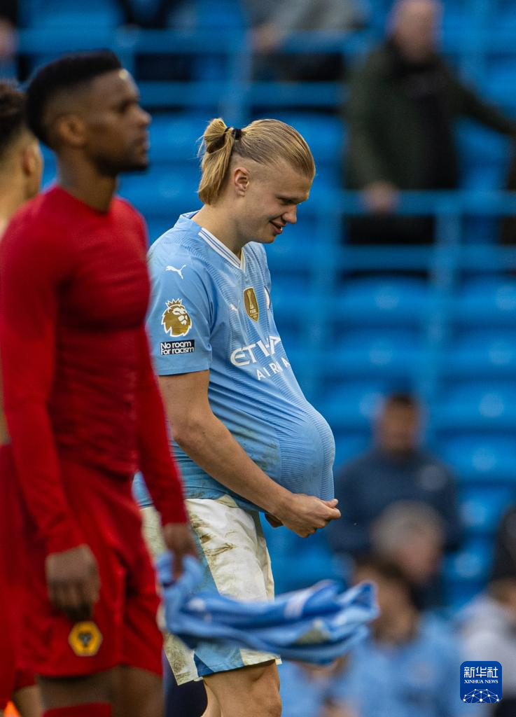 5月4日,在本场打入四粒进球的曼彻斯特城队球员哈兰德(右)赛后将足球塞进衣服内。新华社发